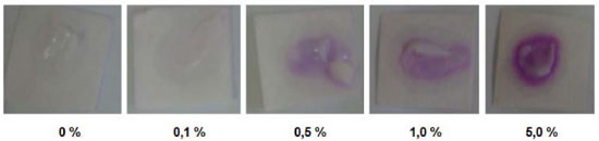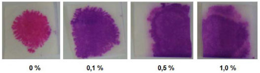 Ensaio com os produtos comerciais Quanto às amostras de xampu e detergente, que podem ser vistas respectivamente nas Figuras 3 e 4, observa-se que nas amostras isentas de formol surgiu uma cor rosácea. Já nas amostras contendo 0,1 vol% de formol, foi possível observar uma diferença de tonalidade em comparaçao com as amostras isentas de formol, porém a cor fica claramente distinguível apenas em 0,5 vol%, sendo que a cor formada é violeta. Em ambos os casos é possível observar uma variaçao da tonalidade em funçao da concentraçao até 1 vol%, porém acima de 5 vol% a cor violeta formada torna-se indistinguível. Nesses testes, verificou-se que, quando gotejadas, devido à sua alta viscosidade, as amostras nao sao rapidamente absorvidas pelo papel, como verificado no caso das soluçoes aquosas, mas este fato nao prejudicou a análise. Já nas amostras de condicionador de cabelo (Figura 5), que possui um aspecto cremoso, sua adiçao direta no papel nao é eficiente, sendo necessária a sua diluiçao prévia com água para se conseguir uma viscosidade menor que permite a absorçao mínima pelo papel de modo a formar a cor púrpura. Esses resultados sugerem que, para aplicaçao da técnica a cosméticos com texturas consistentes, se faz necessária a diluiçao da amostra.