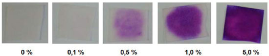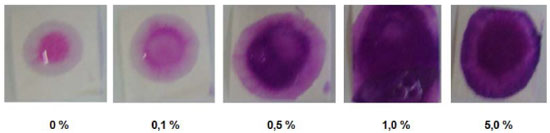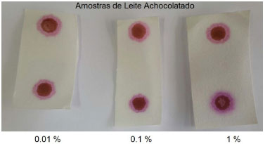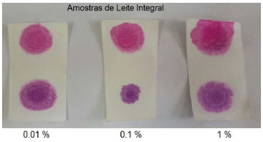 ![]() Figura 6. Ensaio realizado utilizando os papéis impregnados com soluçoes padrao de leite integral em diferentes concentraçoes (vol%)