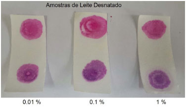 Nos testes com as amostras de leite, foram observadas cores mais intensas em relaçao às obtidas quando outros produtos foram analisados (veja Figura 6). No teste com a amostra de leite isenta de formol, é possível observar com clareza uma cor rosa formada, relativa à p-rosanilina livre gerada em razao da decomposiçao do reagente de Schiff. Deve-se destacar que no caso das amostras de leite foi possível identificar a contaminaçao a partir de concentraçoes de 0,1 vol%, sendo gerada uma cor violeta muito intensa. No entanto, devido à forte intensidade da cor formada, nao é possível distinguir-se das amostras com concentraçoes de formol superiores.