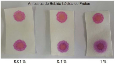 Nos resultados das análises das amostras de bebida láctea de frutas, que podem ser vistas na Figura 10, observa-se um padrao semelhante ao exposto no caso do leite achocolatado, em que a bebida láctea de frutas possui uma tonalidade laranja, que dá origem à mancha laranja central observada nos papéis. Entretanto, ao contrário do exemplo anterior, a distinçao entre as cores de amostras nao contaminadas e contaminadas é perceptível, formando claramente uma cor roxa nas amostras contaminadas, mesmo a 0,01 vol%, sendo distinguível do padrao isento de formol de coloraçao rosácea.