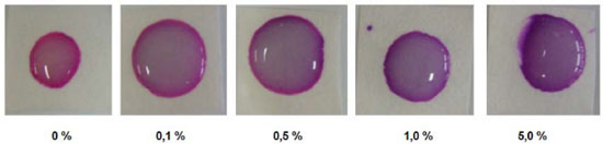 Figura 3. Ensaio realizado utilizando os papéis impregnados, com soluçoes padrao de detergente em diferentes concentraçoes (vol%)