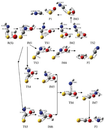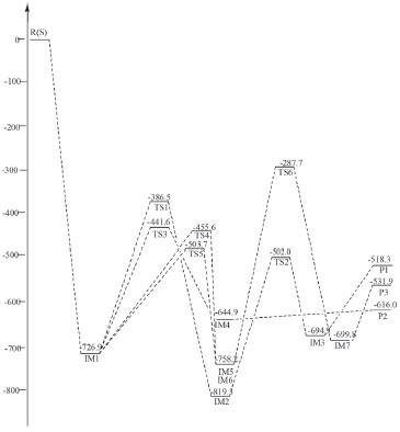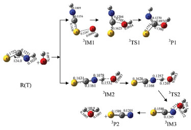 H1-atom in HNCS transfer to OH- channel In Figure 4, 3IM2 formed 3IM3 through transition state 3TS2 with the energy barrier of 308.5 kJ mol-1, and the length of H1-N bond increased to 0.1257 nm (3TS2) from 0.1532 nm (3IM2). The length of H1-O bond varied from 0.1532 nm (3IM2) to 0.1185 nm (3TS2) to 0.0972 nm (3IM3). In this step, H1-O bond formed and H1-N bond dissociated gradually. The formation of 3IM3 from 3IM2 through transition state 3TS2 had the energy barrier of 309.5 kJ mol-1. Finally, 3IM3 dissociated into generate product 3P2 (3SCN- +H2O). Comparing the two pathways, the direct extraction OH- channel had the lowest energy barrier. Therefore, the direct extraction OH- channel was the major reaction channel in the reaction of triplet state OH- with HNCS.