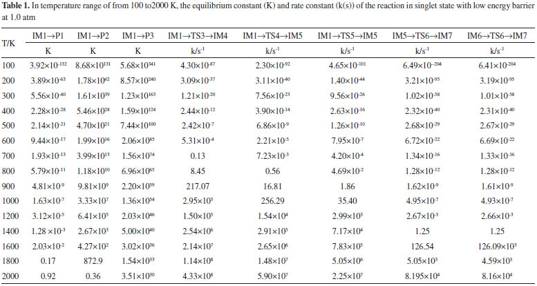 CONCLUSIONS In this study, the B3LYP method of density functional theory was employed to research the reaction mechanism of OH- and HNCS. The calculation results showed that the reaction of singlet state had four feasible pathways and that of triplet state was two. The H1-atom in HNCS transfer to OH- channel in singlet state reaction was the main reaction channel with the lowest energy barrier. The rate constant and equilibrium constant of the H1-atom in HNCS transfer to OH- channel in singlet state were higher than other channels in the temperature range of 100 to 2000 K. This study might provide theoretical clue to control environment pollution. By comparing with the main channel of singlet state reaction, the energy barrier of this pathway was higher. So, the reaction of triplet state was not the predominant way of OH- with HNCS reaction.
