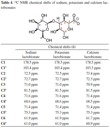 In all 1H NMR spectra, obtained in D2O, the signal corresponding to the anomeric hydrogen is clearly identified which is presented as a doublet at 4.52 ppm and J = 7.7 Hz (1H). The signal at 4.15 ppm, J = 2.8 Hz (1H), is attributed to the hydrogen attached to the carbon which makes the glycosidic bond. The other signals are presented as multiplets in the region between 4.10 and 3.50 ppm. In 13C NMR spectrum the chemical shifts (δ) of sodium, potassium and calcium lactobionates (Table 4) also show a consistent relationship between the signals for both lactobionate salts. In the spectrum it was identified the twelve signals referring to the twelve carbon atoms present in the molecule. The signal observed at 178 ppm is attributed to the carbonyl carbon and the signal at 103 ppm is attributed to the anomeric carbon of the galactosidic moiety. The other signals are located between 61 and 81 ppm. The data are in agreement with those previously reported.23