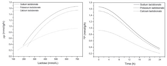 RESULTS AND DISCUSSION Three bioconversion tests were conducted in order to evaluate the bioproduction kinetics of sodium, potassium and calcium lactobionates by Z. mobilis enzyme system GFOR/GL immobilized in calcium alginate. The assays were conducted in parallel, in triplicate, and with cells / enzymes from the same cultivation. Table 1 shows the results of the kinetic parameters obtained in the bioconversion assays.
