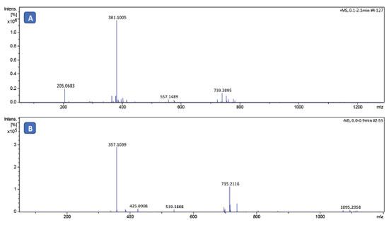 In the positive mode it was identified the presence of the ion with m/z of 381.1005 corresponding to the protonated sodium lactobionate molecule ([M+H]+, Table 3). Additionally it was observed in the spectrum the ion with m/z of 205.0683 related to sorbitol [M+Na]+. The corresponding sorbitol ion was only observed in the mass spectrum of sodium lactobionate, which was obtained in a purity of 94% (Table 2). In the spectrum obtained in the negative mode (Figure 3B), were observed the ion with m/z of 357.1039, which was attributed to the [M-Na](-) ion, and the ion with m/z 715.2116 attributed to the ion [2M-2Na+H]-.