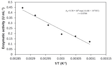 ![]() Figure 1. Arrhenius plot of the enzymatic activity as a function of the inverse of the absolute temperature for the amylase produced by Alicyclobacillus acidocaldarius CBMAI 0298