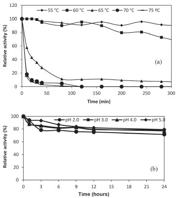 ![]() Figure 2. Effect of temperature (a) and pH (b) on stability of amylase. The activity of the enzyme was 100% at pH 3.0 and a temperature of 75 ºC. The activity of the non-heated enzyme was defined as 100%