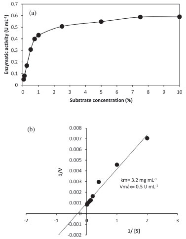 ![]() Figure 3. Effect of substrate concentration (soluble potato starch) on the enzymatic activity of amylase produced by Alicyclobacillus acidocaldarius (a). Graph of enzyme kinetic and apparent Km and Vmax values according to Lineweaver-Burk (b)