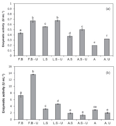 ![]() Figure 4. Enzymatic activity of amylase (a) and collagenase (b) immobilized in loofa sponge, alginate-sponge, alginate and free biomass with and without ultrafiltration system. F.B: Free Biomass, L.S: Loofa Sponge, A.S.: Alginate-sponge, A: Alginate. U: Ultrafiltration. Means followed by the same letters did not significantly differ according to Tukey's test (P <0,05)