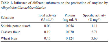 RESULTS AND DISCUSSION Production of amylase by Alicyclobacillus acidocaldarius CBMAI 0298 using different substrates Different substrates in the production of the amylase enzyme by A. acidocaldarius, such as soluble potato starch, cassava flour and wheat bran, were evaluated. The results of the enzymatic activity varied according to the substrate used, as shown in Table 1. After the microorganism cultivation in wheat bran, the enzyme activity was 0.45 U mL-1. This value was seven times higher than the activity following cultivation of the microorganism in soluble potato starch (0.06 U mL-1), and cassava flour (0.19 U mL-1). The nutritional composition of wheat bran and the type of starch present may be responsible for this increased enzyme activity. Similarly, Rajoka et al.,24 concluded that the nutritional composition of wheat bran contains appropriate quantities of carbohydrates, proteins, fats, fiber and ashes (Ca, Mg, P, K, S), favored the microbial growth and enzymes production. Based on this result, wheat bran was selected for the production of the enzyme and to perform the subsequent testing of the characterization of the enzyme extract. Kumar et al.,25 described amylase activity for A. acidocaldarius MTCC 8766 of 0.78 U mL-1 using a substrate of soluble potato starch, while Bai et al,26 obtained activity of 1.23 U mL-1 with a culture of Alicyclobacillus sp. in soluble potato starch.