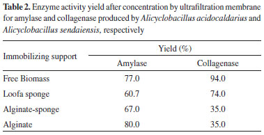 CONCLUSION The present study found that it was possible to produce amylase and collagenase by A. acidocaldarius and A. sendaiensis respectively, with amylase exhibiting thermostable characteristics. Industrial byproduct was used for amylase production, including wheat bran substrate, which was the best substrate for this enzyme, and was thus an economically viable option for industry. The enzyme extract from A. acidocaldarius selected for characterization exhibited favorable properties such as stability at high temperatures and low pH values, as well as stability in refrigerated storage. The use of immobilization systems provided an increase in the amylase enzymatic activity, especially when loofa sponge was used as an immobilization matrix. For collagenase, the immobilization results did not differ significantly among themselves in comparison with the use of free cells. The use of the ultrafiltration system was favorable for both enzyme extracts, and it is a possible candidate for use in industrial enzyme preparations in the starch and collagen hydrolysis.