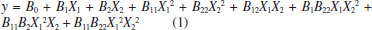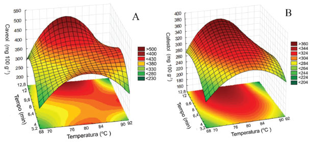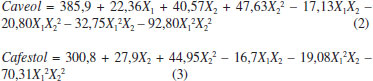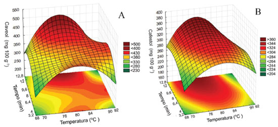 Com base nos fatores significativos (p < 0,05) gerou-se o modelo matemático que descreve o efeito da temperatura (X1) e do tempo (X2) sobre a extraçao de caveol e cafestol (Equaçoes 2 e 3) na reaçao de saponificaçao em micro-ondas. Obtiveram-se coeficientes de determinaçao (R²) de 0,94 para a extraçao do caveol e de 0,91 para o cafestol, indicando boa qualidade no ajuste dos dois modelos. ![]() Para o caveol, constatou-se que a temperatura (termo linear) e o tempo (termo linear e quadrático) exerceram efeito positivo; para o cafestol, o tempo (termo linear) também apresentou efeito positivo (p < 0,05), porém a temperatura nao teve efeito significativo (p > 0,05) (Tabela 2, Eq. 2 e 3). As demais interaçoes, para ambos os compostos, apresentaram efeito negativo, o que sugere a presença de uma faixa satisfatória de estudo, na qual atinge-se o máximo do teor de caveol e cafestol, seguido de reduçao, devido à formaçao de pontos de inflexao (Tabela 2, Equaçao 2 e 3, Figura 2). Esse comportamento demonstra que o tempo e a temperatura sao parâmetros importantes para a reaçao de saponificaçao e que as interaçoes entre eles sao limitantes no processo.