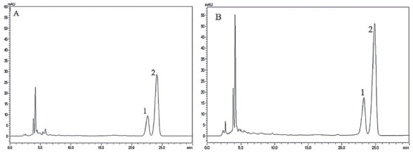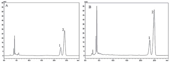 Figura 3. Cromatogramas dos diterpenos, caveol e cafestol, em café arábica torrado obtidos após a saponificaçao em micro-ondas (80 ºC/12 min) (A) e em banho térmico (80 ºC/60 min) (B). Detecçao: 230 nm. Picos: caveol (1) e cafestol (2)