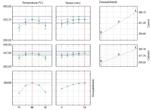 Considerando o interesse em maximizar a extraçao conjunta dos diterpenos, utilizou-se a funçao de desejabilidade global, uma técnica de otimizaçao simultânea, que indicou que a melhor condiçao de saponificaçao ocorreu em 80 ºC durante 12 min (Figura 4). Nessa condiçao, foram obtidos teores de caveol e cafestol de 474 ± 16 e 373 ± 14 mg 100 g-1, respectivamente (Tabela 1). De acordo com os perfis de desejabilidade de tempo e temperatura (Figura 4), é possível observar que a temperatura foi otimizada, uma vez que temperaturas acima ou abaixo de 80 °C diminuem a quantidade extraída tanto de caveol quanto de cafestol. Entretanto, o aumento do tempo de processo poderia aumentar o conteúdo de diterpenos, pois 12 min foi o tempo máximo utilizado no planejamento fatorial, apesar da tendência ser de estabilizaçao próximo a 12 min.