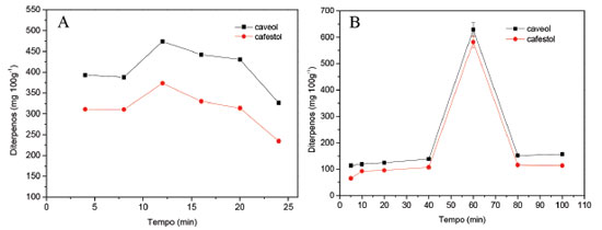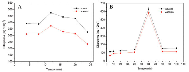 Figura 5. Perfil da concentraçao de caveol e cafestol obtidos por saponificaçao em micro-ondas (A) e em banho térmico (B) a 80 ºC em funçao do tempo de reaçao