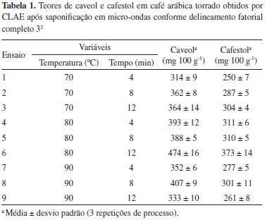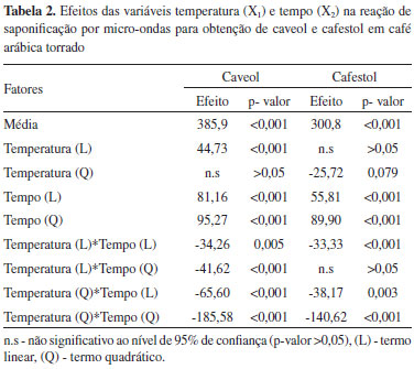RESULTADOS E DISCUSSAO Conforme o delineamento experimental, os teores de caveol e cafestol obtidos por CLAE após saponificaçao em micro-ondas variaram de 314 a 474 mg 100 g-1 e de 250 a 373 mg 100 g-1, respectivamente (Tabela 1). Para a saponificaçao conduzida em banho, utilizada como método de referência, foi obtido teor de caveol de 629 mg 100 g-1 e de cafestol de 582 mg 100 g-1; esses valores encontram-se na faixa descrita na literatura para café arábica brasileiro.11,34-36 Através da tabela de efeitos (Tabela 2), observa-se que a temperatura e o tempo sao parâmetros importantes, mas que exercem influência diferente sobre cada composto. As tabelas de ANOVA correspondentes estao disponíveis no Material Suplementar (Tabelas 1S e 2S).