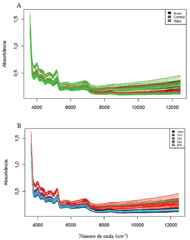 ![]() Figura 1. Conjunto dos espectros originais de reflectância difusa na regiao do NIR, sem transformaçoes matemáticas, da parte aérea das espécies Raphanus sativus L., Secale cereale L. e Avena strigosa L. (A) e espectros nos diferentes tempos de avaliaçao, aos 60, 80 e 100 dias após a semeadura a campo e aos 15 e 30 dias após o acamamento (B)