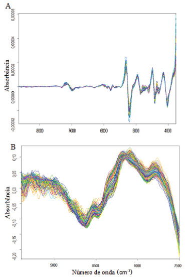 ![]() Figura 2. Conjunto dos espectros de NIR da parte aérea das espécies Raphanus sativus L., Secale cereale L. e Avena strigosa L. após o pré-processamento (segunda derivada) para a construçao das curvas de calibraçao de fenólicos totais (A) e (1ª derivada Savitzky-Golay e normalizaçao vetorial (janela de 17 pontos) e de flavonoides totais (B)