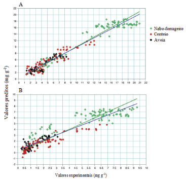 O conjunto de calibraçao, para os parâmetros químicos fenólicos e flavonoides totais, aplicando o método PLS, foi otimizado em funçao do número de variáveis latentes, do coeficiente de correlaçao (r) e do erro médio quadrático do conjunto de calibraçao (RMSECV). O melhor modelo PLS obtido para o parâmetro fenólicos totais foi obtido utilizando 4 variáveis latentes com o coeficiente de correlaçao de 0,93 e 1,53 de RMSECV (Tabela 1). Frizon et al.,4 ao determinarem o conteúdo de compostos fenólicos em 85 amostras de plantas de erva mate (Ilex paraguariensis) via NIR, obtiveram, nos diferentes modelos propostos, coeficientes de correlaçao próximos ao obtido neste estudo, entre 0,80 a 0,90, e erros em torno de 20 a 22 mg g-1, dez vezes maior ao erro encontrado neste trabalho. Em relaçao ao número de outliers, foram excluídas em média de 7 a 8% do total das amostras avaliadas (Tabela 1). A maioria dos trabalhos que utilizam o NIR para a construçao de curvas tem excluído em torno de 2 a 8% do total de amostras.3,30,31 Foram eliminadas, portanto, as amostras que sofreram algum tipo de contaminaçao na obtençao dos espectros ou que se encontraram fora do intervalo previsto para os dados em questao.30 Na calibraçao, a relaçao entre as concentraçoes obtidas pelo método de referência versus as concentraçoes preditas de fenólicos encontraram-se na faixa de calibraçao de 0,4 a 21,0 mg g-1 (Figura 3A). As amostras analisadas 9,0 mg g-1, que sao principalmente as espécies analisadas aos 15 e 30 dias após o acamamento e as gramíneas aveia-preta e centeio. No limite superior, de 15 a 21 mg g-1, encontra-se predominantemente a espécie nabo-forrageiro (Figura 3A). As maiores concentraçoes encontradas no nabo-forrageiro podem ser atribuídas às características da espécie, que é conhecida por sua atividade alelopática e pela sua produçao de compostos fenólicos.32,33