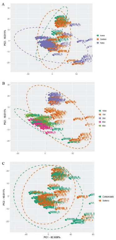 ![]() Figura 4. Distribuiçao fatorial dos componentes principais 1 (PC1) e 2 (PC2) dos espectros de reflectância na regiao do infravermelho (3500 a 8700 cm-1) das amostras sólidas, em relaçao às espécies de plantas de cobertura (A), em relaçao aos tempos de avaliaçao, aos 60, 80, 100 dias após a semeadura e 15 e 30 dias após o acamamento das plantas (B) e em relaçao ao sistema de cultivo (C)