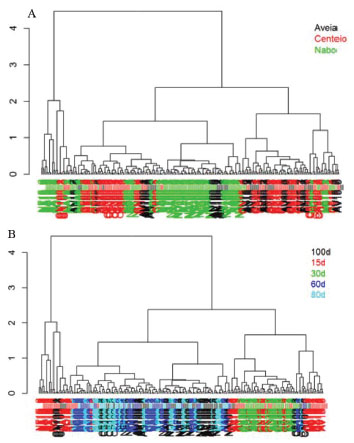 ![]() Figura 5. Dendograma dos espectros de reflectância obtido pela análise de cluster hierárquico utilizando distância euclidiana, em relaçao às espécies (A) e em relaçao às épocas de coleta (B)