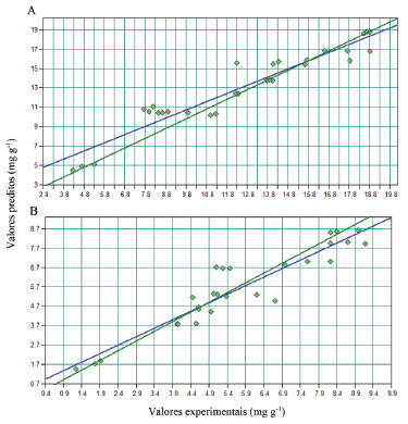 ![]() Figura 3. Curvas de calibraçao dos valores preditos pelo NIR versus os valores experimentais pelo método de referência de compostos fenólicos totais (A) e flavonoides (B) (mg g-1) aplicando o modelo de regressao por mínimos quadrados parciais (PLS)