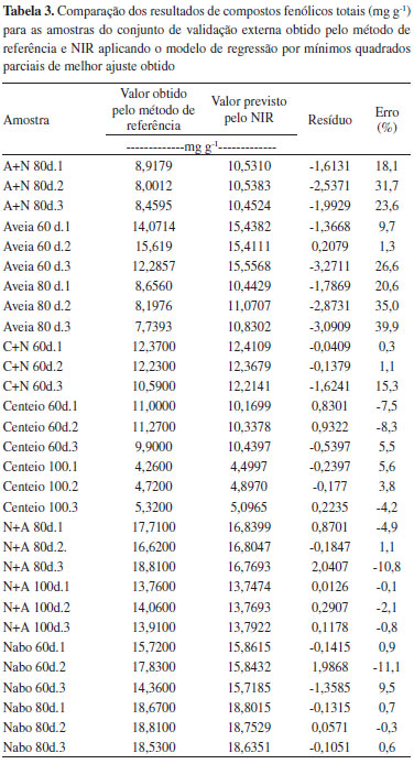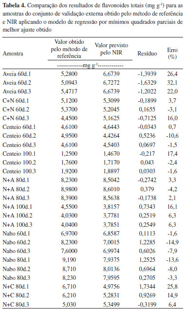 Para fenólicos totais, o erro médio quadrático do conjunto de validaçao (RMSEP) foi de 1,44 e o coeficiente de correlaçao de 0,95 e, para flavonoides, o RMSEP foi de 0,77 e o coeficiente de correlaçao de 0,94 (Tabela 2). Yong et al.,34 ao analisarem os teores de flavonoides em folhas de Ginkgo biloba, obtiveram um RMSEP de 2,62 mg g-1, enquanto Frizon et al.4, ao determinarem os teores de compostos fenólicos totais em folhas de erva mate, obtiveram o melhor modelo com um RMSEP de 12,12 mg g-1 e um coeficiente de 0,81. Nas Tabelas 3 e 4 apresentam-se, para fins comparativos, os valores obtidos pelo método de referência, os valores obtidos pelo NIR, o resíduo e o erro percentual (%) para os teores de fenólicos e flavonoides totais das amostras para a construçao das curvas validaçao externa, respectivamente.
