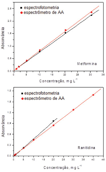 Segundo a Farmacopeia Brasileira, comprimidos de MET devem conter no mínimo 95% e no máximo 105% da quantidade declarada na bula, enquanto comprimidos de RAN devem possuir no mínimo 90% e no máximo 110% da quantidade declarada.17 Todas as amostras analisadas apresentam valores concordantes de MET e RAN com as respectivas especificações das bulas dos medicamentos. De modo geral, as determinações realizadas no espectrômetro de AA resultaram em valores de concentração para MET e RAN com erros inferiores a 5% e 10%, respectivamente, em relação ao valor de referência de cada medicamento. Sendo assim, todas as marcas analisadas estavam de acordo com os limites especificados pela farmacopeia brasileira. Sartori e colaboradores12 determinaram concentração de MET em três amostras de medicamentos contendo diferentes concentrações de MET por titulação condutimétrica. Os resultados obtidos mostraram boa concordância com as concentrações de MET informadas na bula de cada amostra. A RAN foi determinada em três diferentes marcas por Malagutti e colaboradores,16 os resultados obtidos pelos autores também mostraram boa concordância com os informados na bula do medicamento.