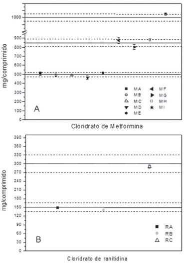 ![]() Figura 2. Concentrações de MET (A) e RAN (B), expressas em mg do princípio ativo por comprimido, obtidas no espectrômetro de AA para amostras comerciais de medicamentos, comparadas com as concentrações declaradas nas bulas (linha sólida) e as respectivas variações máximas de ± 5% para MET e ± 10% RAN (linha pontilhada) em relação à quantidade declarada. Amostras MA, MB, MC, MD, ME: 500 mg; MF, MG, MH 850 mg e MI 1000 mg de MET/comprimido. RA, RB:150 mg e RC: 300 mg de RAN/comprimido
