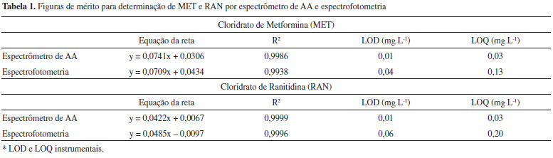 Comparando com a espectrofotometria, a ampliação da faixa linear de calibração em determinações moleculares usando o espectrômetro de AA foi também observada na determinação de cafeína e cloridrato de propranolol, monitorando linhas espectrais de lâmpadas de cátodo oco de Fe e Mg, respectivamente. Segundo os autores,10 uma das vantagens da utilização do espectrômetro de AA para medidas de compostos moleculares é a ampliação da faixa linear de calibração para determinação de alguns compostos. Considerando que a radiação monocromática é um dos termos mais importantes para aplicação da lei de Lambert-Beer, a ampliação da faixa linear, neste caso, está relacionada à radiação específica emitida pela lâmpada de cátodo oco. As figuras de mérito obtidas para determinação de MET e RAN no espectrômetro de AA e por espectrofotometria estão apresentadas na Tabela 1. Os coeficientes de correlação linear obtidos para as determinações utilizando espectrômetro de AA foram satisfatórios, com valores de R2> 0,99. As determinações realizadas com o espectrômetro de AA apresentaram sensibilidade, avaliadas pelos coeficientes de correlação angular das curvas de calibração, similares as obtidas por espectrofotometria. Os valores do limite de detecção (LOD) foram calculados considerando 3 vezes o desvio padrão de dez medidas consecutivas do branco das amostras dividido pelo valor da inclinação da respectiva curva de calibração e os limites de quantificação (LOQ) definidos como 3,3 vezes o LOD. Como observado, os valores de LOD foram inferiores aos obtidos por espectrofotometria. Considerando a concentração de MET e RAN normalmente encontradas em medicamentos, os LODs obtidos são adequados para determinação destes compostos em medicamentos. A determinação de RAN em medicamentos foi realizada por Malagutti e colaboradores16 utilizando-se ultramicroeletrodo de platina com eletrodepósito de mercúrio e o eletrodo de gota pendente de mercúrio. Com este método, o valor de LOD obtido para determinação potenciométrica de RAN foi de 0,011 mg L-1, sendo este valor similar ao LOD encontrado para determinação de RAN e MET utilizando espectrômetro de AA.