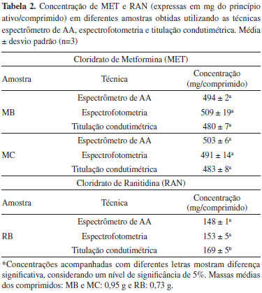 Verificação da exatidão e precisão A verificação da exatidão das determinações de MET e RAN com o espectrômetro de AA foi avaliada por meio da comparação dos resultados obtidos por espectrofotometria e titulação condutimétrica, utilizando nitrato de prata como titulante. Na Tabela 2 estão apresentados os resultados obtidos para as determinações de MET e RAN em amostras de medicamentos, utilizando as diferentes técnicas analíticas.