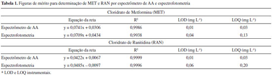 ![]() Figura 1. Curvas de calibração obtidas para cloridratos de metformina (MET) e ranitidina (RAN) utilizando espectrômetro de absorção atômica (espectrômetro de AA) e espectrofotometria