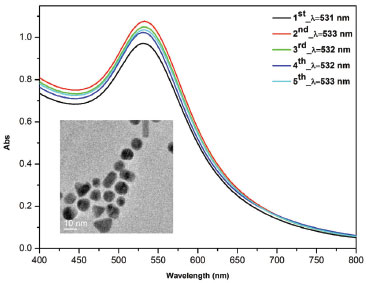 ![]() Figure 6. Extinction spectra of AuNP synthesized five times with a 5 minutes interval between each synthesis. The AuNP were prepared with 0.33 mmol L-1 HAuCl4 and 1.0 mmol L-1 Irgacure 2959 in 24-well plates at 15 minutes UV-A exposure. Insert: TEM images of AuNP