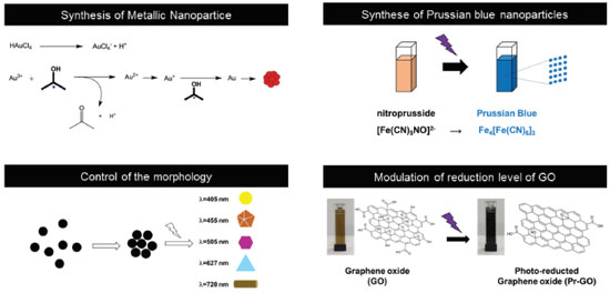 Figure 1. Overview of the main uses of light to produce (nano)materials. Figure adapted from references 2, 4-6