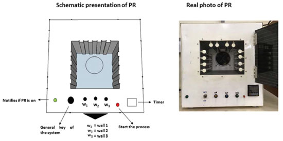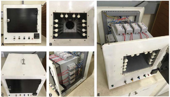 The inner walls of the chamber were made of steel coated with a temperature resistant paint. As can be seen in Figure 3, a timer with a push button and an on/off switch were installed for time monitoring and start of the system, respectively. An acrylic plate of dimensions (30 x 24 cm) coated with black plastic film was used to cover the door to avoid light exposure by the user (Figure 4-A). A pilot lamp was fixed to indicate the on/off operation of the system. Lamps sockets for four lamps (8 W, 30 cm) were installed on each of the lateral and upper walls on the inner side of the chamber (Figure 4-B). Also, a handle was attached to the top of the reactor for handling and transport. (Figure 4-C).