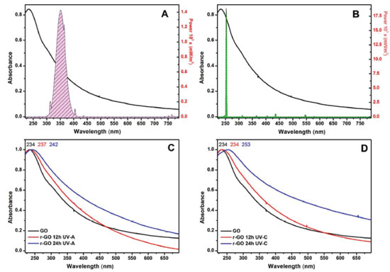 Figure 7. The observed differences between electronic spectra of graphene oxide after irradiated by (A) UV-A lamps and (B) UV-C lamps. UV-Vis absorption spectra of GO before and after 12h and 24h of irradiation with (C) UV-A lamps and (D) UV-C lamps