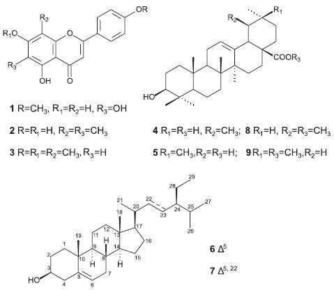 RESULTADOS E DISCUSSÃO O estudo químico do extrato etanólico das folhas de M. ferruginata resultou no isolamento e identificação dos flavonoides 5,6,7-trihidroxi-4'-metoxiflavona (1), 5,7,4'-trihidroxi-6,8-dimetilflavona (2), 5-hidroxi-7,4'-dimetoxi-8-metilflavona (3), dos triterpenos ácido ursólico (4) e ácido oleanólico (5) e identificação da mistura dos esteróides β-sitosterol (6) e estigmasterol (7) (Figura 1). As estruturas dos compostos isolados foram identificadas com base nas análises dos dados de RMN 1H e 13C 1D e 2D (flavonoides 1, 2 e 3, Tabela 1), análises através de CG-EM, além da comparação com dados da literatura.25-30