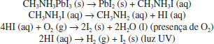 Estabilidade Dois parâmetros são considerados importantíssimos para a aplicação comercial de células solares de perovskitas: a eficiência de conversão e a estabilidade. Hoje, altas eficiências foram alcançadas (>20%) em um período de tempo relativamente curto. Entretanto, para aplicações práticas, esses dispositivos ainda apresentam diversos problemas quanto à estabilidade a longo prazo, devido à degradação das PSCs quando expostas à umidade e oxigênio, radiação UV, processo de dissolução (solventes, solutos, aditivos) e temperatura.38,74,156,157 As perovskitas mais usadas em células solares são facilmente decompostas na presença de umidade e oxigênio, devido à presença do grupo higroscópico amina em sua estrutura molecular. Niu et al. propuseram uma sequência de reações químicas para a degradação da perovskita sob diferentes condições.157,158 ![]() Devido a sensibilidade &ag, rave; umidade e oxigênio, PSCs geralmente são fabricadas em ambientes com atmosfera e umidade controlados (glove box) com gás inerte, para evitar sua degradação e se obter melhores eficiências de conversão; porém, a utilização de glove box eleva o custo de preparação.139-141 Em um dos primeiros trabalhos que avaliaram a estabilidade de células solares de perovskitas, Noh et al. estudaram o sistema MAPb(I1-xBrx)3, e observaram que a perovskita com x=0 (MAPbI3) apresentava valores de eficiência que decresciam lentamente em presença de 35% de umidade, mas, quando esta era aumentada para 55%, um decréscimo abrupto da eficiência acontecia.40 Avaliando as outras composições, os autores observaram que a composição com x=0,20 ou maior mantinham a eficiência mesmo com a umidade de 55%. Analisando a estrutura cristalina, as composições com x igual ou maior que 0,2 passavam da estrutura tetragonal para cúbica, o que pode estar relacionado com a maior estabilidade das células solares.40 Outro mecanismo de degradação da perovskita reportado por Ito et al.159 é causado pela extração de elétrons do I- pelo TiO2. Nesse mecanismo, pela perda de elétrons do I- na superfície do TiO2, ocorre a formação de I2, destruindo, assim, a estrutura cristalina da perovskita. O metilamônio perde, então, seu próton ácido, formando metilamina, que tem baixo ponto de ebulição e então evapora. Já o próton perdido se combina com I2 e I- formando HI, que também tem baixo ponto de ebulição e evapora. Uma representação desse mecanismo está mostrado na Figura 11 (a) e (b). Como estratégia para evitar a degradação, os autores depositaram uma camada de sulfeto de antimônio Sb2S3 sobre a TiO2 mesoporoso e observaram que os dispositivos tiveram uma estabilidade superior (Figura 11 (c)) pelo boqueio da reação entre o I- e o TiO2.159