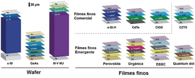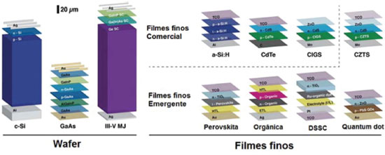 Figura 1. Representação das células solares que compõem as três gerações de células solares. Primeira geração (Wafer), segunda geração (Filmes finos comerciais) e terceira geração (Filmes finos emergentes) (Adaptado com permissão da referência 8)