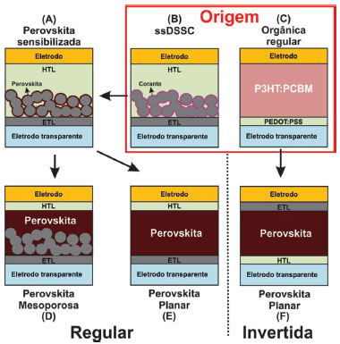 ![]() Figura 2. Diferentes configurações de células solares de perovskitas. (A) Célula solar de perovskita sensibilizada, (B) célula solar sensibilizada com corantes de estado sólido (ssDSSC, do inglês solid state dye sensitized solar cell), (C) célula solar orgânica regular, (D) célula solar de perovskita mesoporosa, (E) célula solar de perovskita planar e (F) célula solar de perovskita invertida