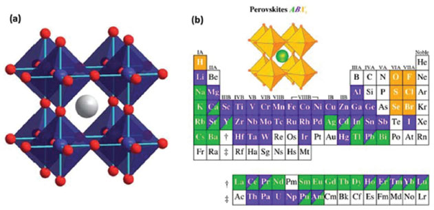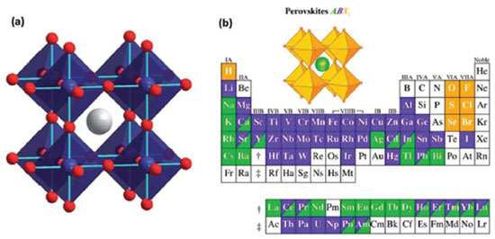 Figura 3. (a) Estrutura da perovskita cúbica ABC3, em que a esfera cinza é o cátion A e as esferas azuis e vermelhas representam os íons B e C, respectivamente; (b) possível combinação de elementos que podem ocupar sítios na grade cristalina de perovskita (Adaptado com permissão das referências 54 e 55)