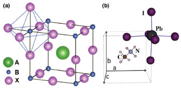![]() Figura 4. Estrutura da perovskita ABX3 mostrando o sítio octaédrico BX6 e o maior cátion A ocupando o sítio cubo-octaédrico, (b) Célula unitária da perovskita cúbica CH3NH3PbI3 (Adaptado com permissão das referências 37 e 58)