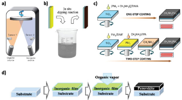 Figura 5. Preparação de filme de perovskita por diferentes métodos de deposição: (a) coevaporação de fonte dupla utilizando PbCl2 e MAI; (b) deposição sequencial de PbI2 em solução de MAI; (c) deposição em solução de etapa única utilizando a mistura PbI2 e MAI, e deposição sequencial de PbI2 e MAI; (d) solução assistida por vapor utilizando PbI2 e vapor de MAI (Adaptado com permissão das referências 66, 83, 84 e 85)