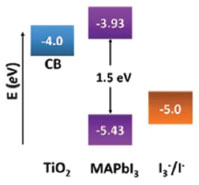 ![]() Figura 6. Diagrama de nível de energia do TiO2, CH3NH3PbI3 e do par redox I3-/I- (Adaptado com permissão da referência 59)
