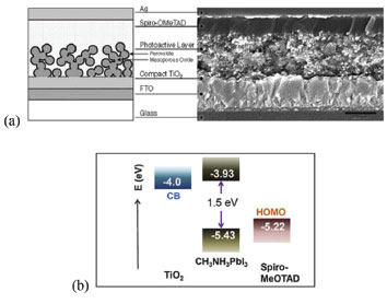 ![]() Figura 7. (a) Diagrama esquemático (esquerda) e microscopia da sessão transversal da célula solar mesoporosa sensibilizada por perovskita (direita). (b) Diagrama de nível de energia de TiO2, MAPbI3 e spiro-MeOTAD (Adaptado com permissão das referências 37, 38 e 66)
