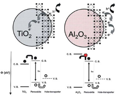 ![]() Figura 8. Esquema ilustrando a transferência e o transporte de carga na célula solar de perovskita de TiO2 e uma célula solar não-injetora baseada em Al2O3 (Reimpresso com permissão da referência 105)