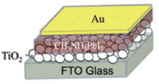 Surpreendentemente, no mesmo ano, Etgar et al.43 demonstraram que essas células solares de TiO2 mesoporoso não necessitam de materiais HTL para funcionar - nesse caso, o transporte de buracos ocorre simplesmente através da camada de perovskita. O estudo inicial foi a partir da deposição da perovskita sobre nanofolhas de TiO2, por spin-coating, seguido de evaporação do eletrodo de ouro, obtendo-se a célula solar apresentada na Figura 9. As células solares obtidas apresentaram PCE de 5,5% (Jsc = 16,1 mA cm-2, Voc = 0,63 V e FF = 0,57), a qual foi aumentada para 8,0% por Etgar et al.106 em outro trabalho expandindo a espessura da perovskita. Atualmente, o recorde de eficiência de células solares sem condutor de buracos é de 11,2%, tratando a perovskita com um antisolvente, reportado por Cohen et al.107 O sucesso no funcionamento desses dispositivos indica que MAPbI3 pode agir também como um transportador de buracos eficiente. Porém, o Voc desses dispositivos são mais baixos do que aqueles produzidos com spiro-MeOTAD, indicando que a falta da camada transportadora de buracos resulta em um aumento da recombinação. Assim, com dispositivos comprovando que as perovskitas podem transportar tanto elétrons como buracos, essa família de perovskitas é considerada com uma natureza de transporte ambipolar de cargas.36,43,59,107