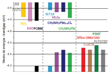 ![]() Figura 10. Níveis de energia para vários materiais usados em Células Solares de Perovskitas: transportadores de elétrons (esquerda) e buracos (direita) (Adaptado de 76)