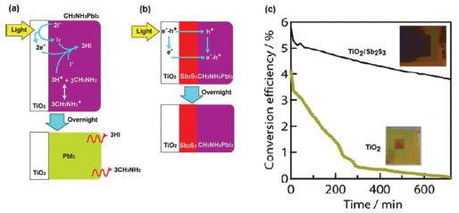 ![]() Figura 11. Esquema de degradação da perovskita MAPbI3 quando exposta à luz sobre eletrodos de (a) TiO2 mesoporoso e (b) TiO2 mesoporoso recoberto com Sb2S3. Gráfico de eficiência de conversão em função do tempo para os eletrodos de TiO2 e TiO2/Sb2S3 (Adaptado com permissão da referência 159)